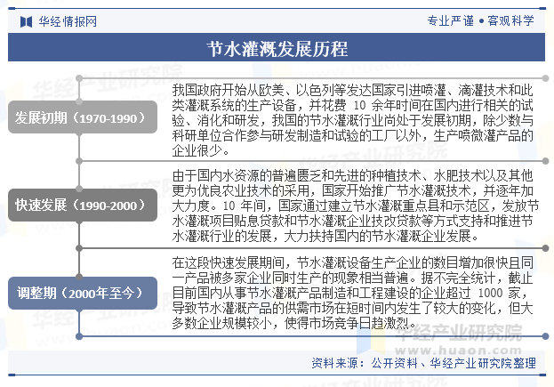 我国高效节水主要发展于20世纪70年代中期到80年代后期,主要为节水灌溉技术及生产设备的引进、消化、吸收。20世纪90年代初期到20世纪末,来到了节水灌溉技术推广、节水灌溉行业快速发展阶段。21世纪初至今,市场竞争趋于激烈、行业发展前景看好。