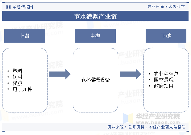节水灌溉产业链是一个涵盖多个环节和领域的复杂系统,上游为原材料和零部件供应。原材料供应商提供制造节水灌溉设备所需的原材料,如塑料、钢材、橡胶、电子元件等。零部件制造商制造生产喷头、滴头、过滤器、阀门、管材等零部件。中游为节水灌溉设备制造商,下游应用主要为农业种植户、园林景观、政府项目。