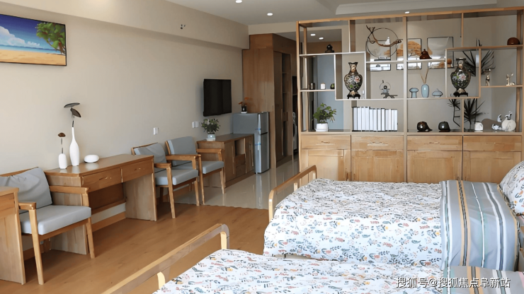 居住空间:单人间面积45-60㎡,配备独立卫浴、智能马桶、紧急呼叫系统及观景阳台;双人间面积70-90㎡,采用适老化双床设计,共享客厅与阳台;套间面积100-130㎡,增设独立厨房、高端卫浴及家庭影院。所有房间均铺设防滑地胶,卫生间配置L型扶手、恒温花洒及洗澡椅,细节处彰显人性化关怀。